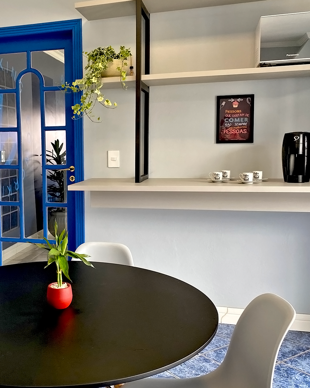 Área acolhedora para pausas e interações sociais, com café fresco sempre à disposição.
